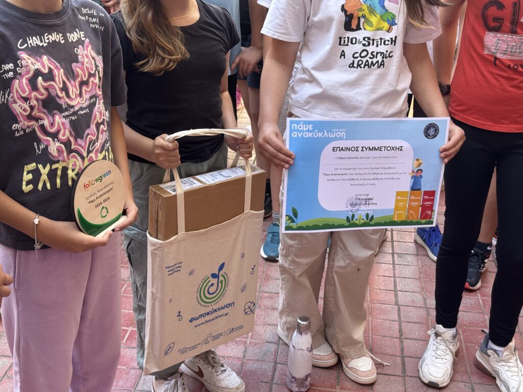 Η προσπάθεια όλων ανταμείφθηκε με τον καλύτερο τρόπο, καθώς το σχολείο μας διακρίθηκε και βραβεύτηκε για την ενεργή συμμετοχή του και τα εξαιρετικά αποτελέσματα που πέτυχε στη διάρκεια του μαραθωνίου. Σε ειδική τελετή που πραγματοποιήθηκε στον χώρο του σχολείου, εκπρόσωποι του Δήμου και της εταιρείας Followgreen παρέδωσαν ένα συμβολικό δώρο – έναν φορητό υπολογιστή (laptop) – στον Διευθυντή του σχολείου, ως αναγνώριση της συλλογικής προσπάθειας και του εκπαιδευτικού έργου που προάγει τη φιλοπεριβαλλοντική συνείδηση.